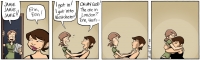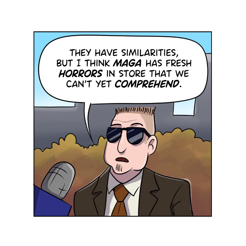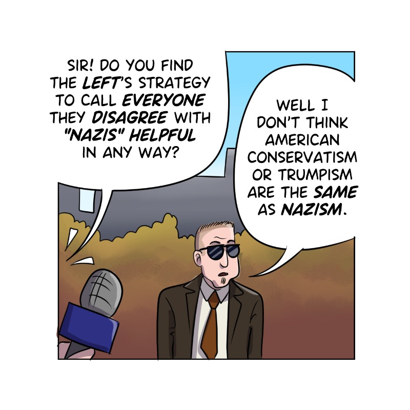 Oh, by the way, the background guy in the gasmask isn’t a pop-culture cameo, so don’t strain yourself trying to place him. Maybe it’s not fair to mix and match like that, but sometimes I just need a wide guy in a cloak to take up space.